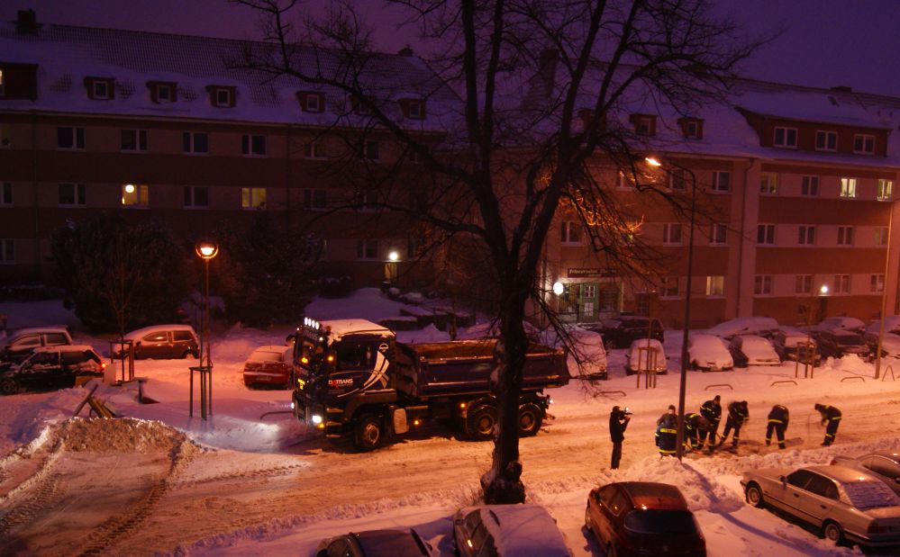Zu sehen sind u.a. verschneite Objekte, welche u.a. Auswirkungen auf ein Fußballspiel hatten (die Polizeibusse sind kurz vor dem Start zur Rückfahrt nach dem nicht erfolgten Fußballeinsatz).