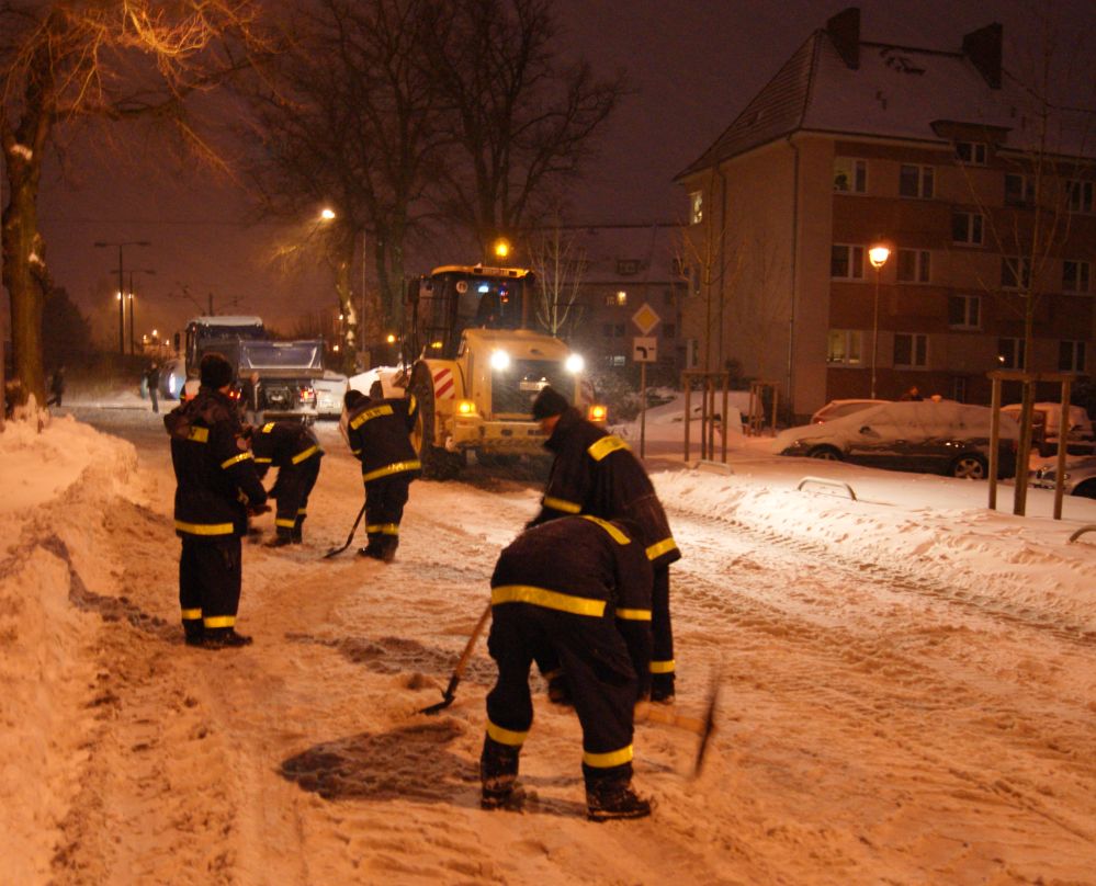 Das Streckennetz der Rostocker Straßenbahn AG mußte (u.a. mit Hilfe des THW) aufwendig freigelegt werden, damit nach vielen Stunden die Straßenbahnen wieder fahren konnten.